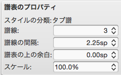 ここでは、3線譜の作成にはウクレレTAB譜を用い、譜線3本に変更(最初の小節を右クリックから)し、譜線の間隔を2.25としましたが、他の方法でも可能です。