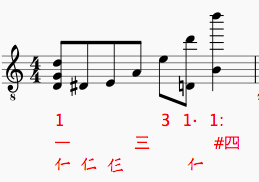 (1オクターブ低いト音記号を使用)(ニンベンは、別の文字として書き加えています。)