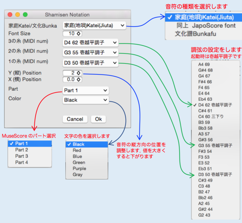 尺八・篠笛・箏・ケーナ、(二胡等の)数字譜での五線譜の音符の下に各楽器の音符や運指を振るプラグインを公開してきましたが、三味線・三絃版を新たに作成しました。MuseScore