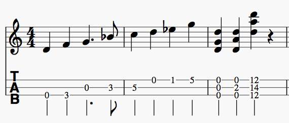 TAB譜は、開放絃が0で、ツボ(フレット)ごとに1,2,3,4...と表され、一オクターブが12となります。文化譜のように♯や♭は付きません。