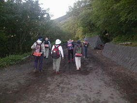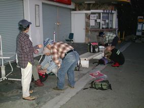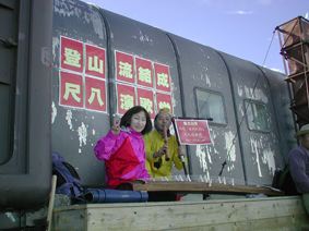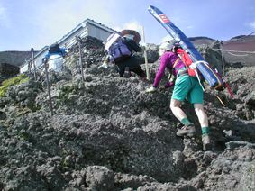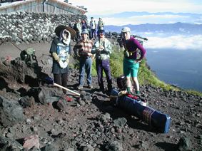富士宮口の神社前で下山しようとしていた富士山掲示板の人たちと記念撮影。強風と断続的な砂塵のため演奏不可能であった。