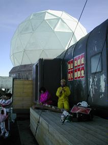 山頂特設ステージで登山流結成記念演奏をする。(日本最高地点の2m後ろでさらに1m高い)