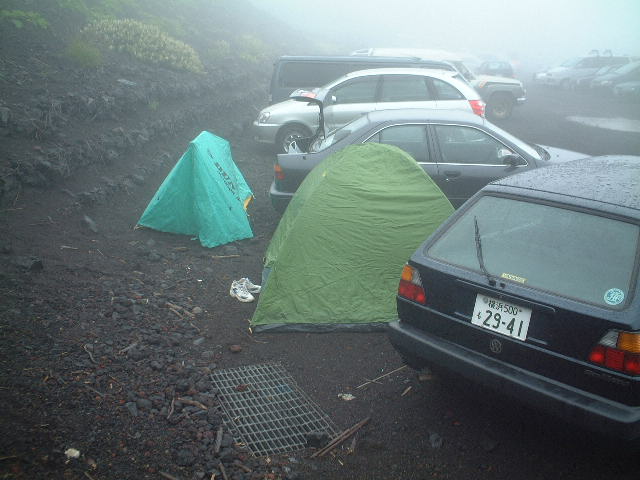 登っているはずのバンブーさんと前日に突然冗談参加となったK氏が戻ってきて、バンブー号(キャンピングカー)で宴会開始。尺八界と政治問題まで盛り上がったが、登山を控えているので5人で缶ビール10缶、ワイン2本と控えめであった。