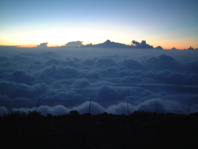 樹林帯を抜けた後、夜明け前の壮大な雲海を望む。