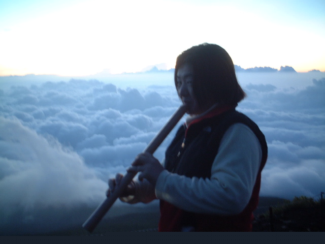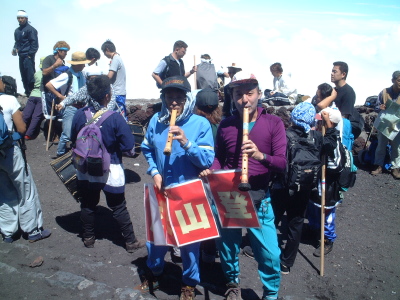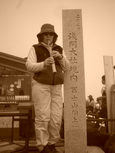 山頂に到達してrin師範(2回目)、K氏と大師範のアウトドア派行動隊長が演奏。K氏は新師範となる。